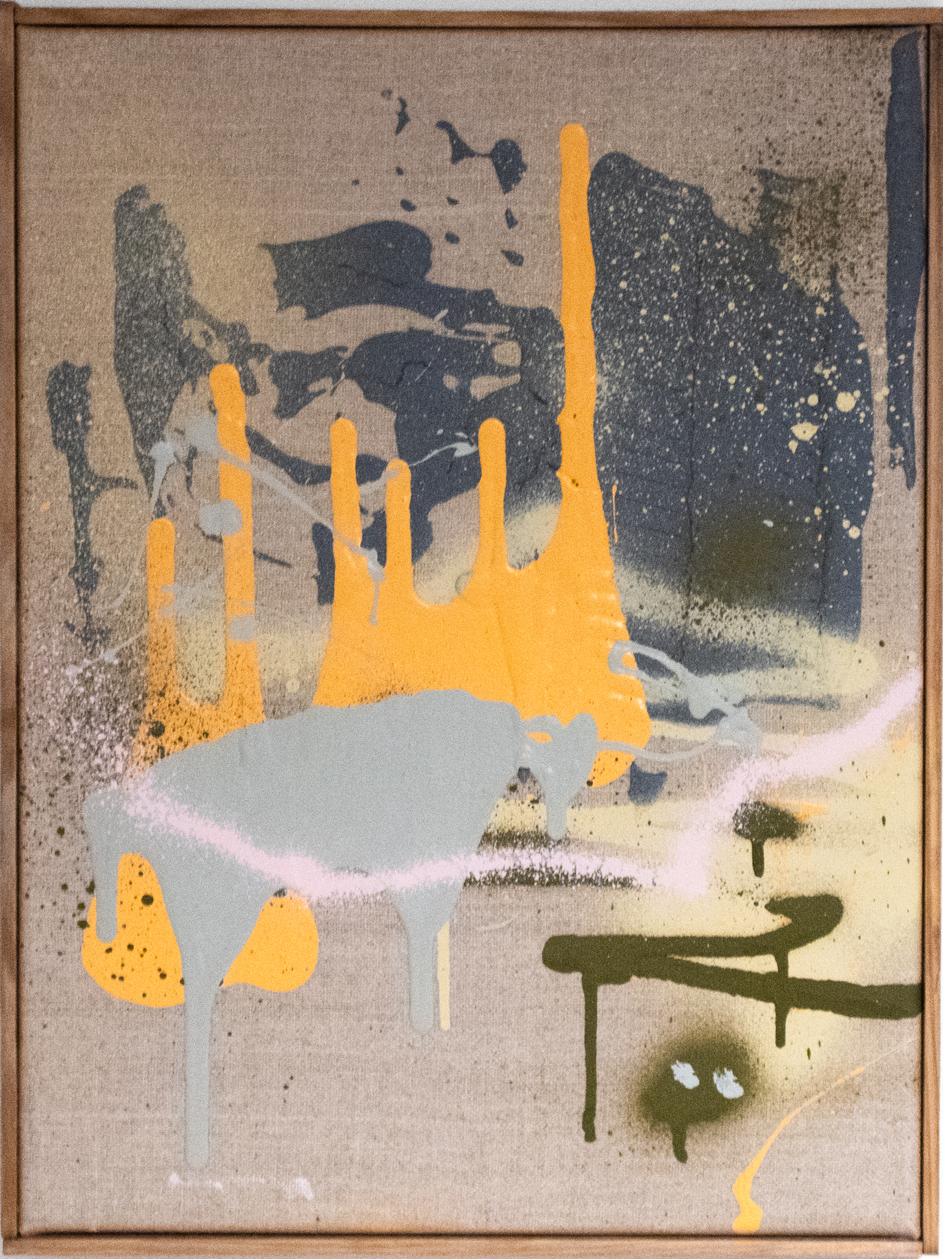 Steinefnaspartl, lakk, sprey, akrýl og málningarflögur á hör