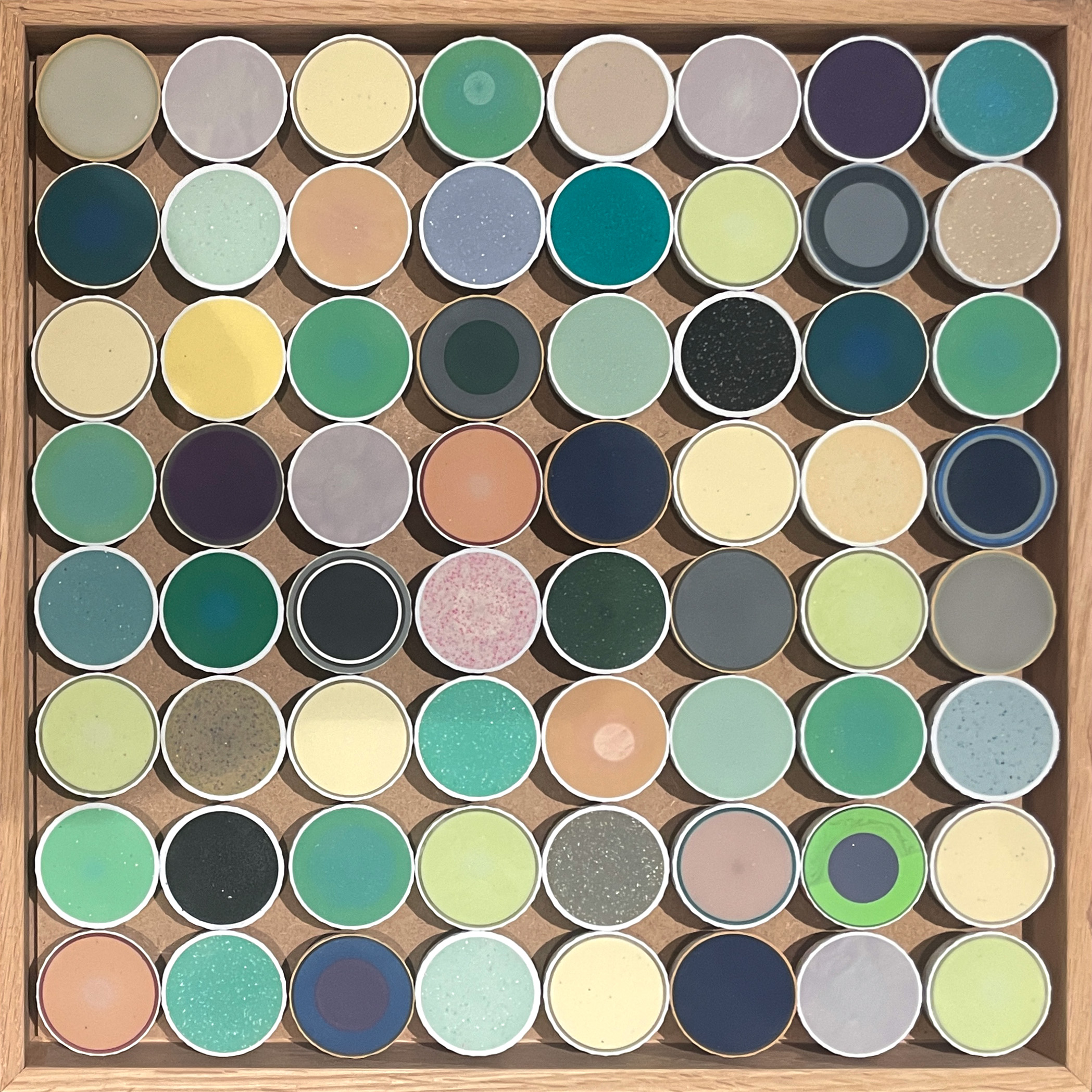 Cut golf balls in oak frame.